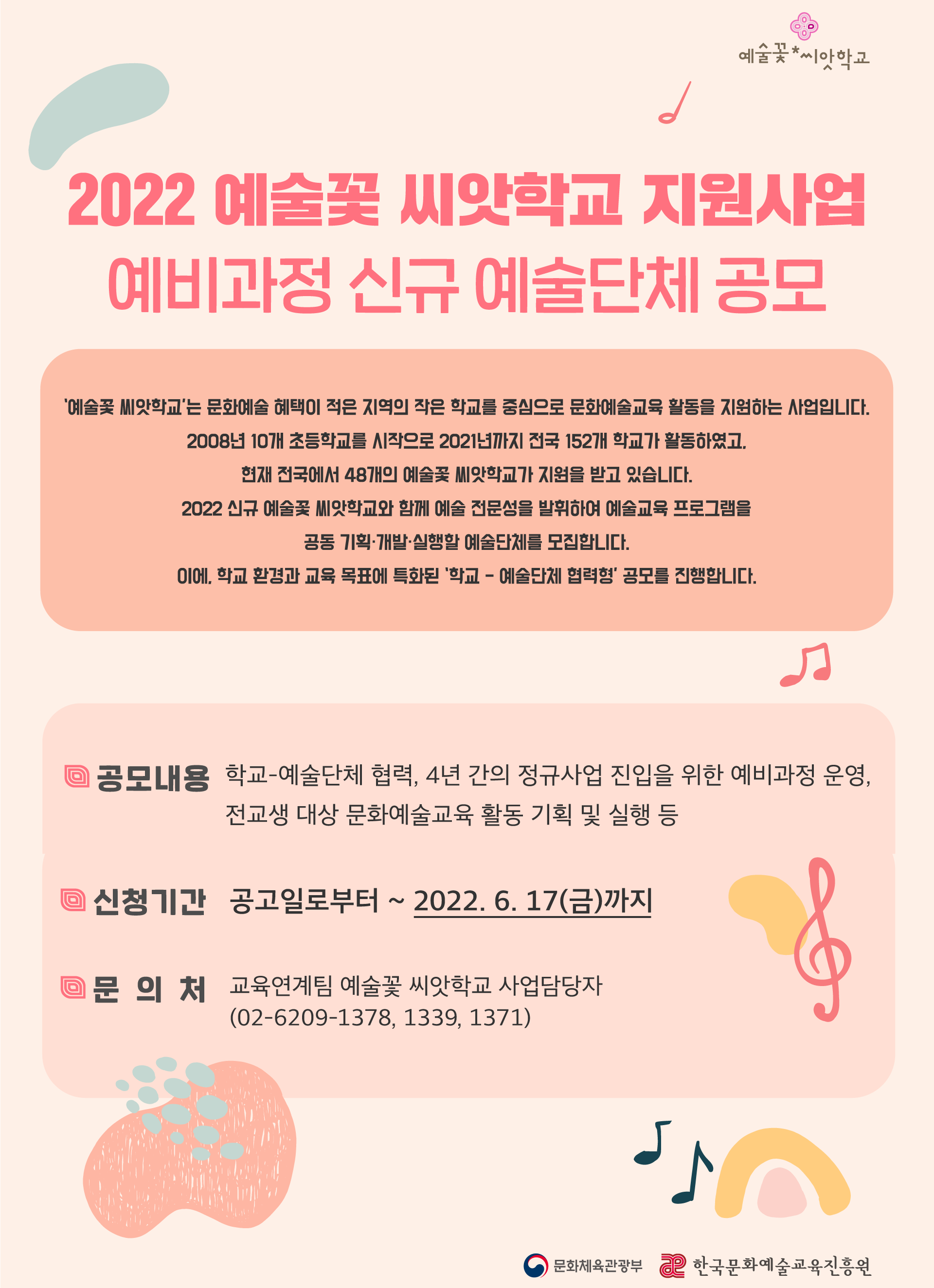 2022 예술꽃 씨앗학교 지원사업 ‘예비과정 신규 예술단체 공모’