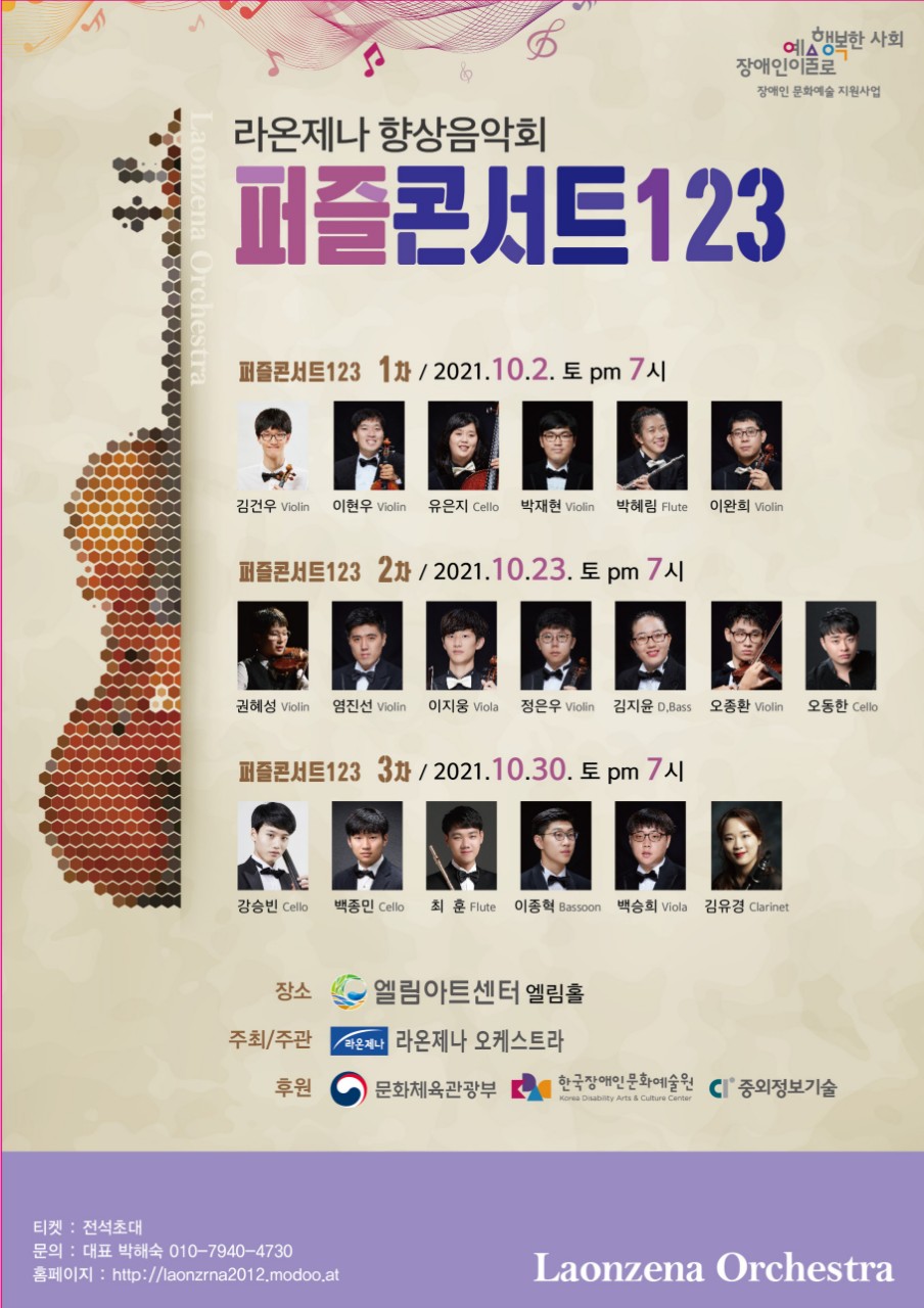 2021-10-02(수) ~ 2021-10-30(수) 장소: 엘림아트센터 엘림홀 주관: 라온제나 오케스트라