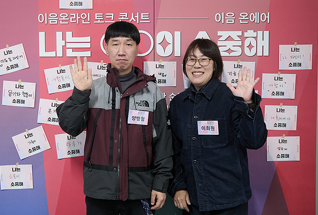 이음온라인 토크 콘서트 이음온에어 포토존 앞에서 양병철 활동가와 이희원 기획위원이 나란히 서서 손을 들어 인사하고 있다. 뒷배경에는 ‘나는 ○○이 소중해’ 문구와 참가자들이 쓴 여러 개의 문구 카드가 부착되어 있다.