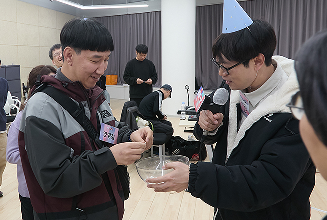 양병철 활동가가 추첨함에서 종이를 뽑고 있고, 옆에서 파티 모자를 쓴 진행자 이성수 힘빼고컴퍼니 대표가 마이크를 들고 함께 확인하며 웃고 있다. 뒤편에는 다른 참가자들이 자유롭게 어울리고 있다.