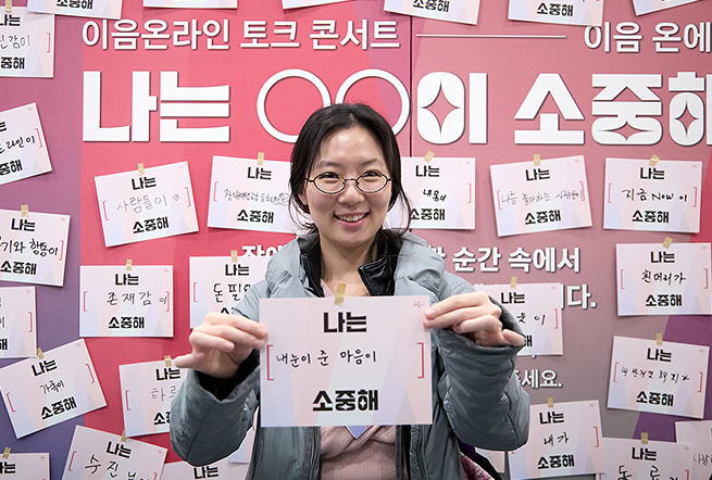 포토존 앞에서 김보라 작가가 ‘나는 내 눈이 준 마음이 소중해’라고 적은 카드를 들고 환하게 웃고 있다. 배경에는 다른 참여자들이 붙인 ‘나는 ○○이 소중해’ 문구 카드가 빼곡히 채워져 있다.