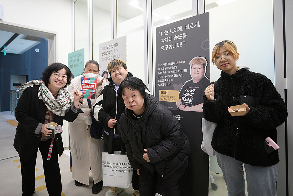조화영 배우의 접근성 선언 전시 패널 앞에서 기념사진을 찍는 장애여성공감 극단 춤추는허리 멤버들
