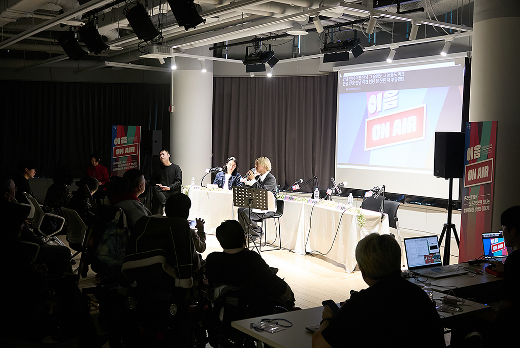 2018년 11월 웹진 [이음]이 창간했고, 2019년 장애인문화예술 지식정보 플랫폼 이음온라인을 열었다. 그동안 웹진이음은 약 740여 개의 기사를 내보냈고, 장애 감수성을 기르는 본격 문학방송 [A의 모든 것]은 시즌6을 맞이했다. 예술가의 출근길 로드무비 ‘예술하러간다GO’으로 시작한 이음온라인 기획영상은 장애배우의 독백 연기 영상 ‘연기가 뭐라GO’ 시즌3에 이르렀다. 그뿐만 아니라 이음광장 필자 공모와 이음리뷰클럽 등 다양한 참여의 장을 열었고, 그 과정에서 많은 예술가를 만나고 생생한 예술 현장을 엿볼 수 있었다. 하지만 온라인 플랫폼으로서 늘 비대면으로만 공유되는 게 아쉬웠고, 함께했던 이들과 직접 만나고 네트워킹하며 이야기 나누는 만남의 장을 꿈꿨다. 그렇게 2025년 11월 4일 모두예술극장 모두스튜디오에서 이음온라인 토크콘서트 ‘이음온에어’라는 판을 벌였다. 누군가의 표현처럼 동창회 같았던, 청명한 가을날의 따뜻한 공기와 씨실과 날실처럼 이어진 우정 어린 현장을 만나보자.