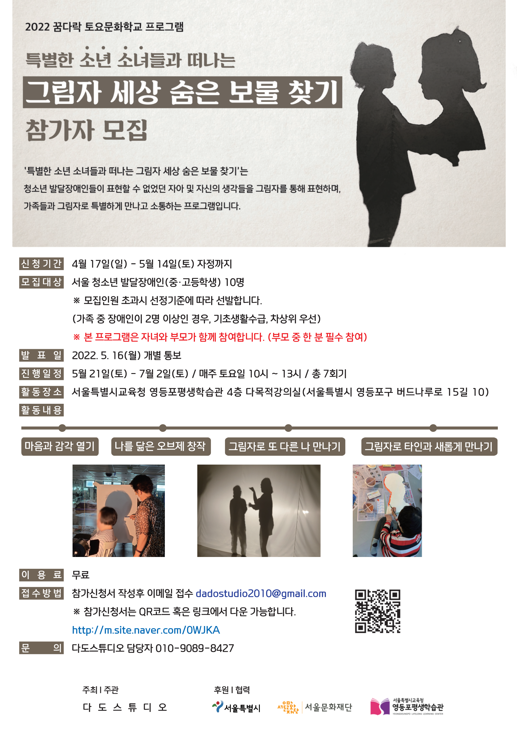 2022 꿈다락 토요문화학교 프로그램 ‘특별한 소년 소녀들과 떠나는 그림자 세상 숨은 보물 찾기’ 참가자 모집