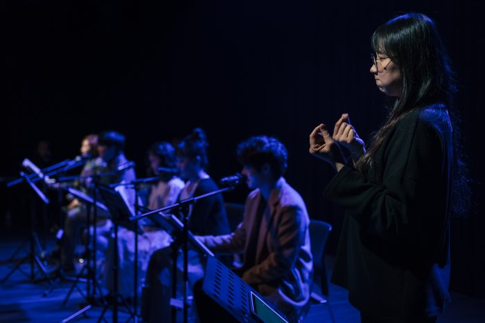 극단 그라이아이는 자막을 배우 옆에 노출했다.