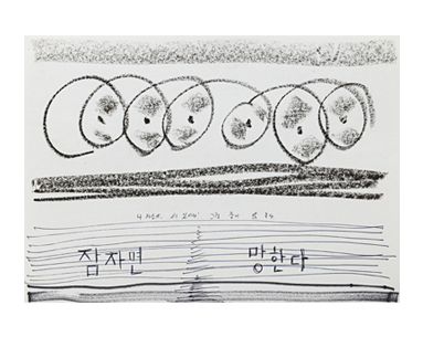 <잠자면 망한다>, 2011, 종이에 펜과 크레용, 297x210mm