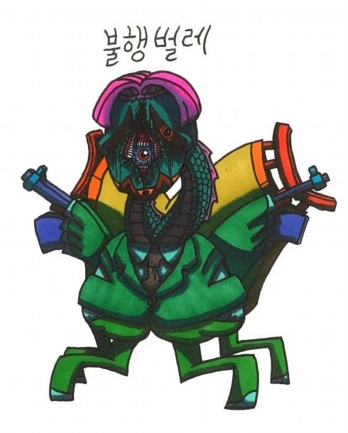 김치형 창작자는 서로 다른 종을 합성하거나 생물과 무생물을 합성하여 기상천외한 캐릭터를 창조하고, 그들이 등장하는 세계를 그린다. 이를테면 해바라기와 햄스터 이빨, 문어의 촉수를 합성하여 ‘거대 해바라기’라는 캐릭터를 만들거나, 와사비와 간장을 먹고 인간에게 사육당하는 ‘초밥 동물’을 창조하는 식이다. 어느 날은 ‘기쁨’ ‘행복’과 같은 감정 또는 추상적 상태와 곤충을 결합하여 위와 같은 벌레군단을 만들었다. 그중에서도 눈에 띄는 것은 언뜻 보기에도 불행해 보이는 ‘불행벌레’였다. 이 벌레를 누가 이렇게 불행에 빠뜨렸냐고 묻자 창작자는 당연하다는 얼굴로 이렇게 말했다. “불행벌레는 자기 스스로 불행을 먹고 사는 벌레예요. 불행이 주식이기 때문에 우울과 상실감에 늘 시달려요.”