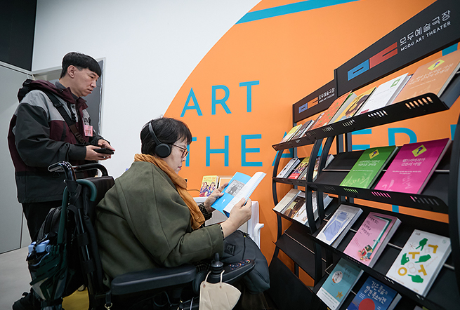 모두예술극장 로비에서 임현주 작가가 휠체어에 앉아 헤드셋을 끼고 책을 읽고 있고, 뒤에는 양병철 활동가가 휴대기기를 들고 함께 공간을 둘러보고 있다. 오른쪽 책장에는 ‘A의 모든 것’ 출연 작가들의 책이 여러 권 진열되어 있다.